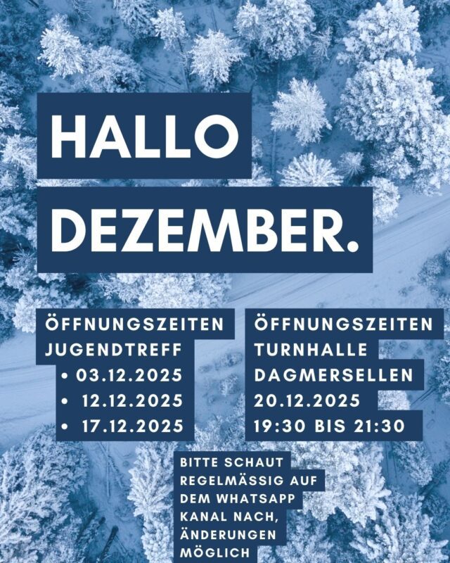 Die Jugendarbeit Dagmersellen unterstützt das Projekt «offene Sporthalle» des Kantons Luzern und bietet von Mitte Oktober bis Ende Januar Raum für regelmässig Bewegung. Der Samstagabend Fun wird durch ein Mitglied der Begleitgruppe beaufsichtigt und findet an folgenden Daten von 19:00 – 21:30 Uhr statt: