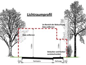 Grundstückeigentümer sind gemäss des Strassengesetzes verpflichtet, die Pflanzen rechtzeitig zurückzuschneiden. Pflanzen auf privaten Grundstücken dürfen das Lichtraumprofil nicht tangieren. Das Lichtraumprofil beträgt 2.50 Meter über Trottoirs und Fusswegen und 4.50 Meter über Strassen. Hecken und Sträucher haben innerorts einen Abstand von mindestens 0.60 m zur Fahrbahn sowie zum Troittoir einzuhalten, gemessen ab äusserstem Rand auf der Strassenseite.